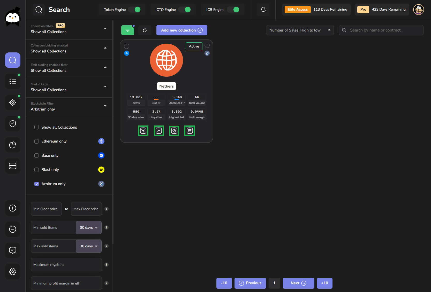 The above screenshot shows available Arbitrum collections filtered by Blockchain on the left. The highlighted buttons will provide the following features: