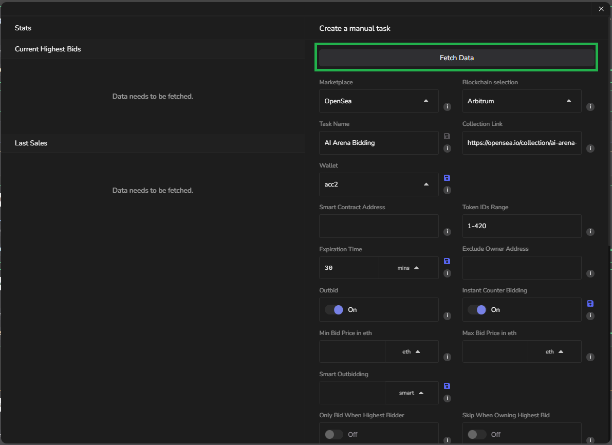 <figure><img src="https://156458129-files.gitbook.io/~/files/v0/b/gitbook-x-prod.appspot.com/o/spaces%2FUpGMSshbhuSUXHzoKrTn%2Fuploads%2FDMjZKACeqWbYkseDLEKa%2Fimage.png?alt=media&#x26;token=e403929c-ca2b-408c-b931-ba7504d19e7d" alt=""><figcaption><p>Creating a manual Arbitrum bidding task for token ids 1 to 420</p></figcaption></figure>