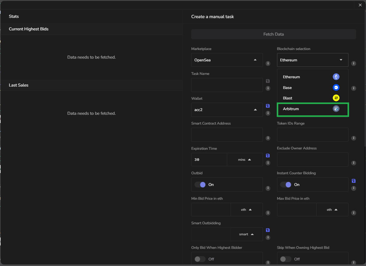 Arbitrum bidding tasks can also be created as[ Manual Task](https://docs.nftbutler.io/nft-butler/task-types/manual-token-id-bidding) providing the collection link, smart contract and a list of token ids: