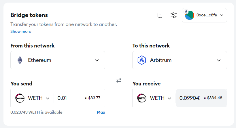 * Metamask is offering a direct Briding Service between different L2 Chains and Arbitrum is one of the supported Chains here. Simply use it with the following link:\
