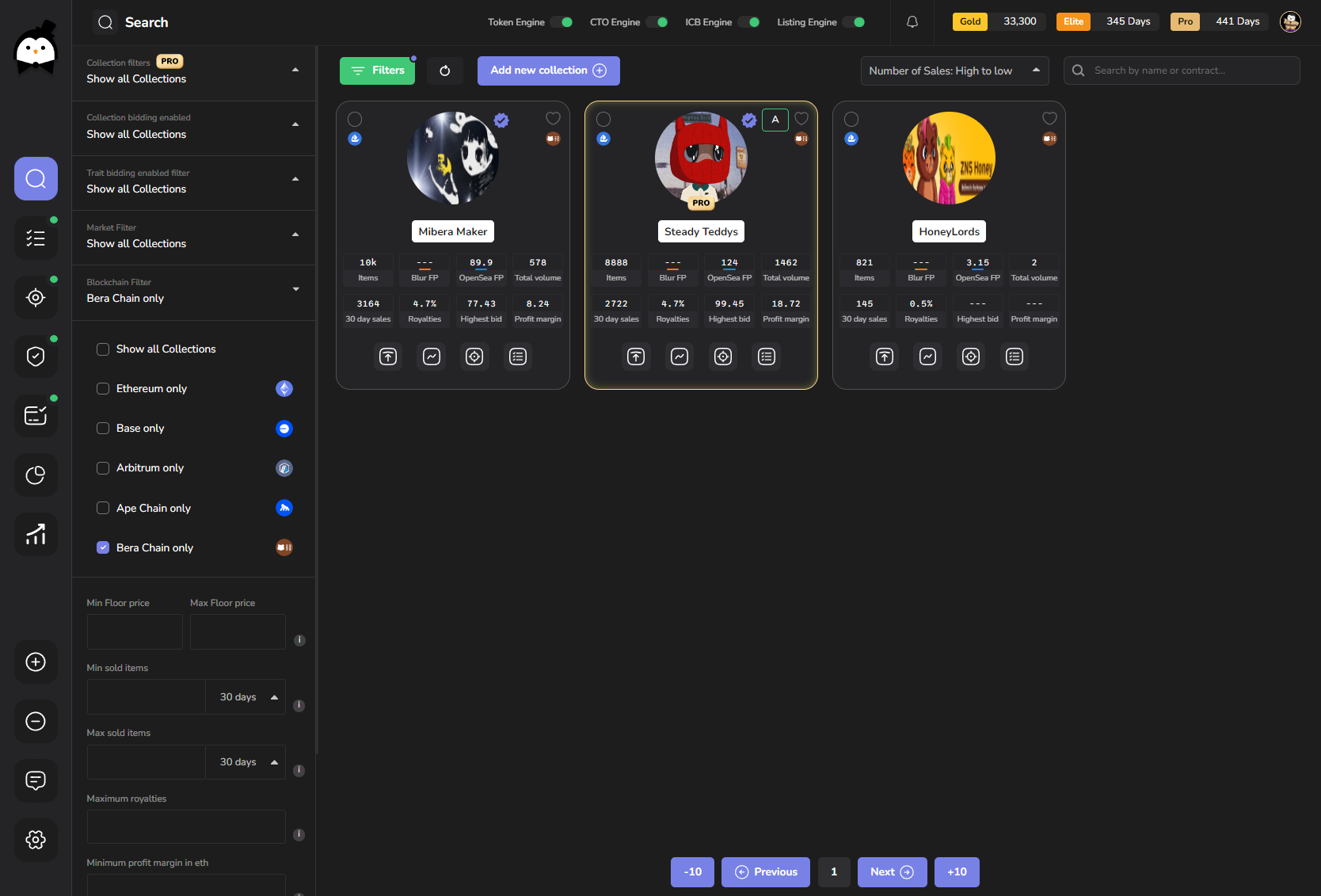 The above screenshot shows available Bera collections filtered by Blockchain on the left. The buttons will provide the following features: