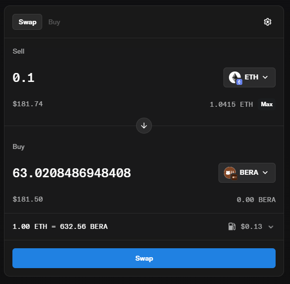 <figure><img src="https://156458129-files.gitbook.io/~/files/v0/b/gitbook-x-prod.appspot.com/o/spaces%2FUpGMSshbhuSUXHzoKrTn%2Fuploads%2FfAvRBipiXHagYjy20WBm%2Fimage.png?alt=media&#x26;token=f9305863-0094-4547-b194-8306d19d7243" alt=""><figcaption><p>Swapping BERA for WBERA</p></figcaption></figure>
