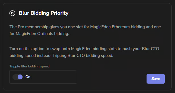 Pro Users can exchange their Magic Eden Token Task bidding slots for additional Blur Bidding speed in Butler settings by enabling the following option: