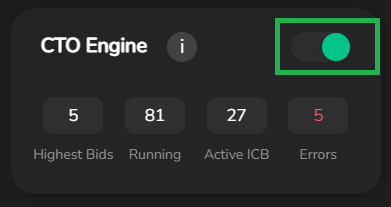 <figure><img src="https://156458129-files.gitbook.io/~/files/v0/b/gitbook-x-prod.appspot.com/o/spaces%2FUpGMSshbhuSUXHzoKrTn%2Fuploads%2FJGaJrv1lqvC6l01adMI7%2Fimage.png?alt=media&#x26;token=26e23148-4d05-4f79-84da-1a4fa7d4a4e4" alt=""><figcaption><p>Enable CTO engine on the Dashboard</p></figcaption></figure>